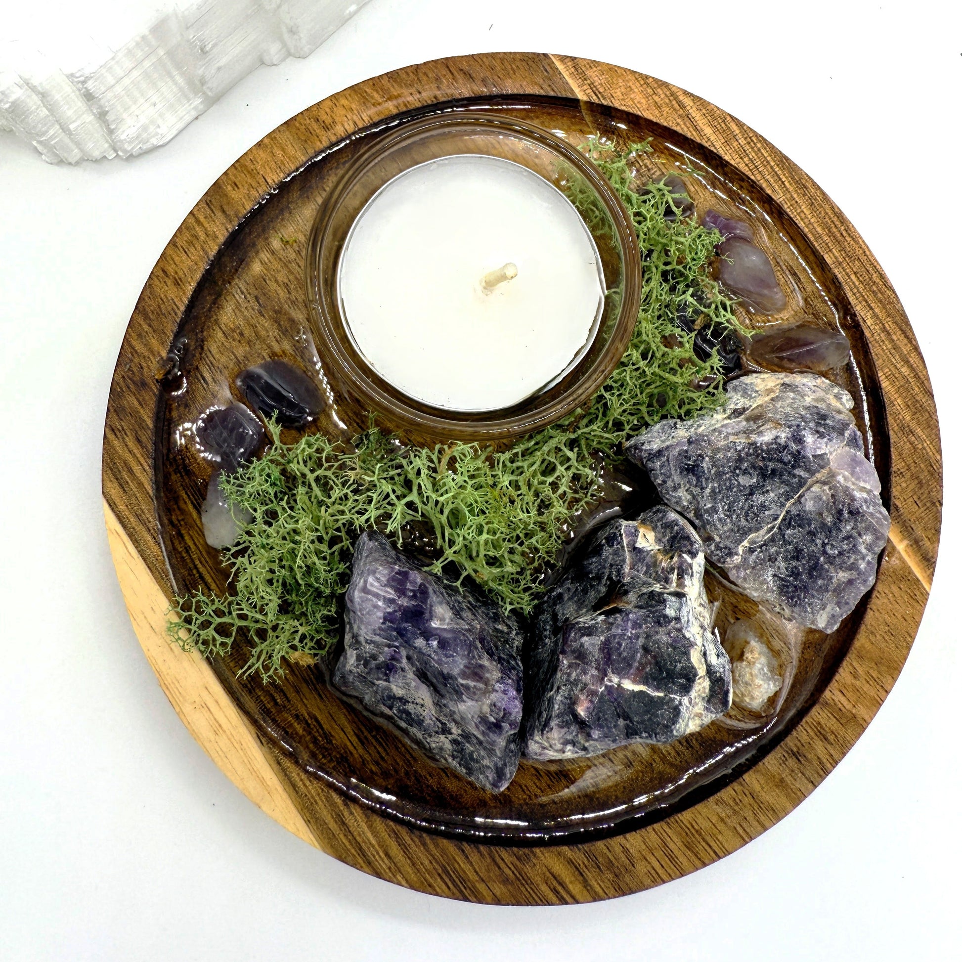 Elevate your sacred space with the calming and spiritually enhancing energy of Amethyst. This Amethyst Meditation Altar is designed for intention-setting, meditation, and spiritual protection, featuring a 5-inch acacia wood coaster, crystal-infused resin, and a tea light holder. Whether used for deep meditation, energy cleansing, or as an altar centerpiece, this piece promotes clarity, relaxation, and a stronger connection to higher consciousness.