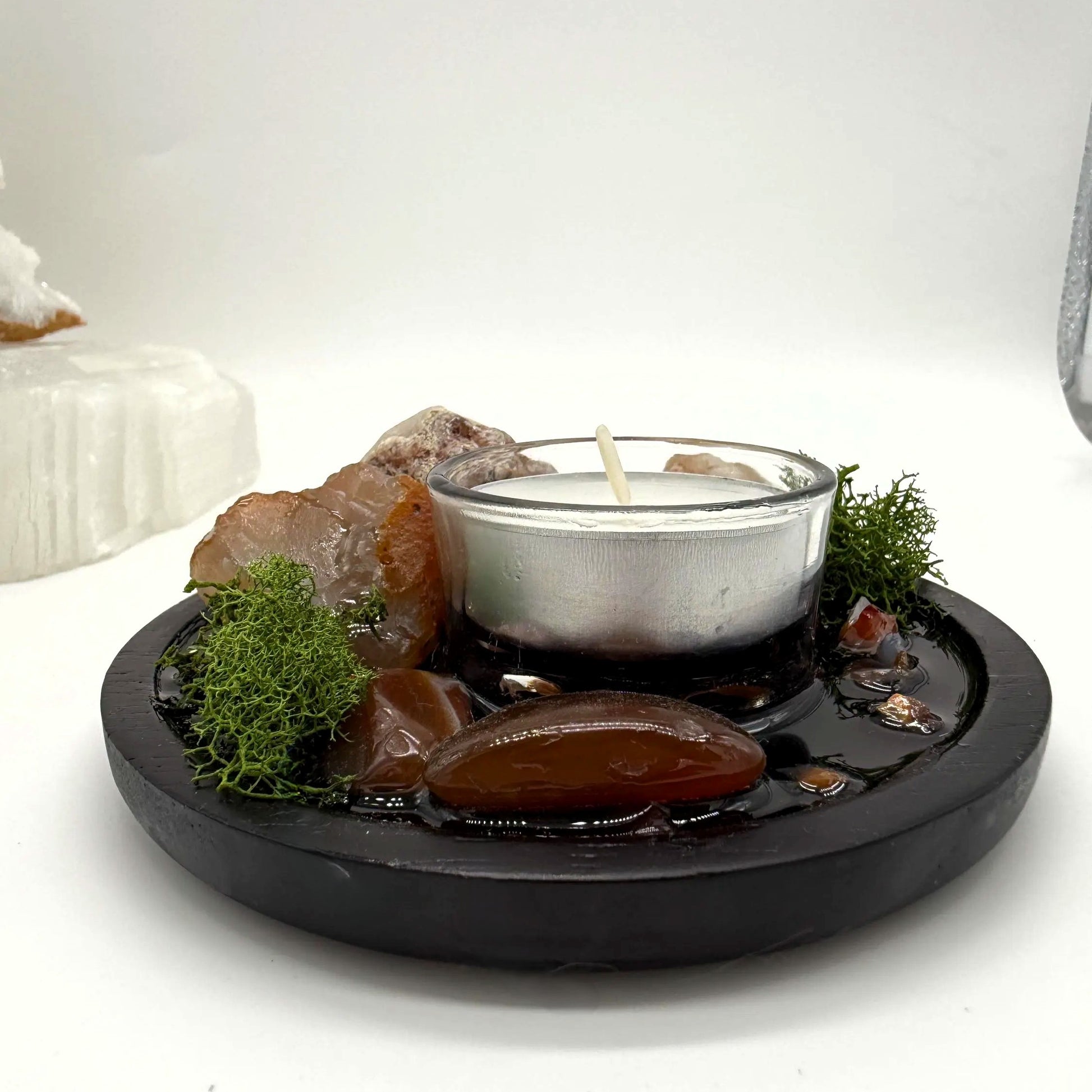 Ignite passion, creativity, and motivation in your sacred space with the empowering energy of Carnelian. This Carnelian Meditation Altar is designed for intention-setting, manifestation, and boosting confidence. Featuring a 5-inch acacia wood coaster, crystal-infused resin, and a tea light holder, this altar serves as a powerful tool for increasing energy, courage, and personal strength.