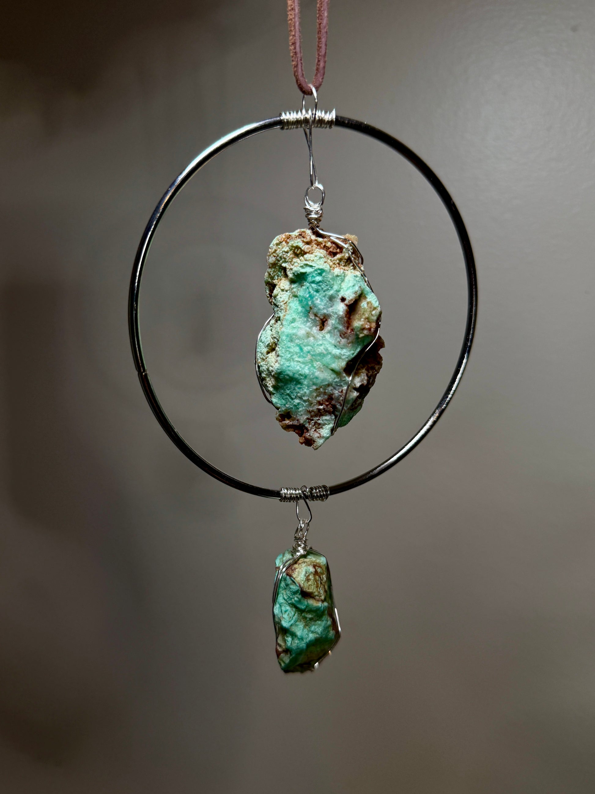 Handmade with intention, this one-of-a-kind gemstone hanging brings both beauty and balance into your space. Featuring a raw 3” Chrysoprase stone wrapped in mixed metal and set in a 4” silver ring, it channels grounding energy with a refreshing, heart-centered frequency. A smaller Chrysoprase hangs from the bottom, amplifying its vibration and creating a continuous flow of light and renewal.