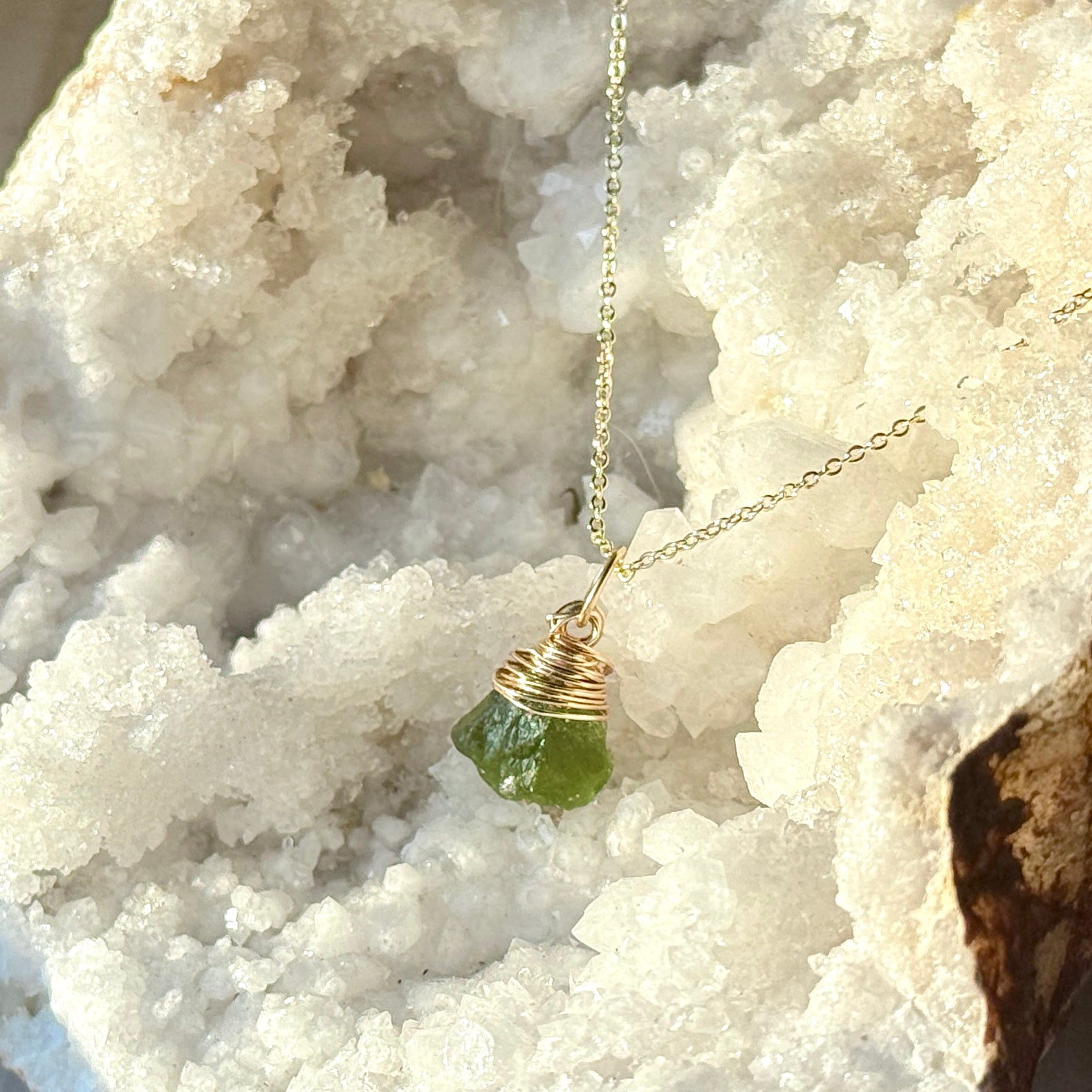 The teardrop-shaped Peridot pendant is hand-wrapped with care and suspended from a dainty chain, offering a timeless yet meaningful piece of jewelry.